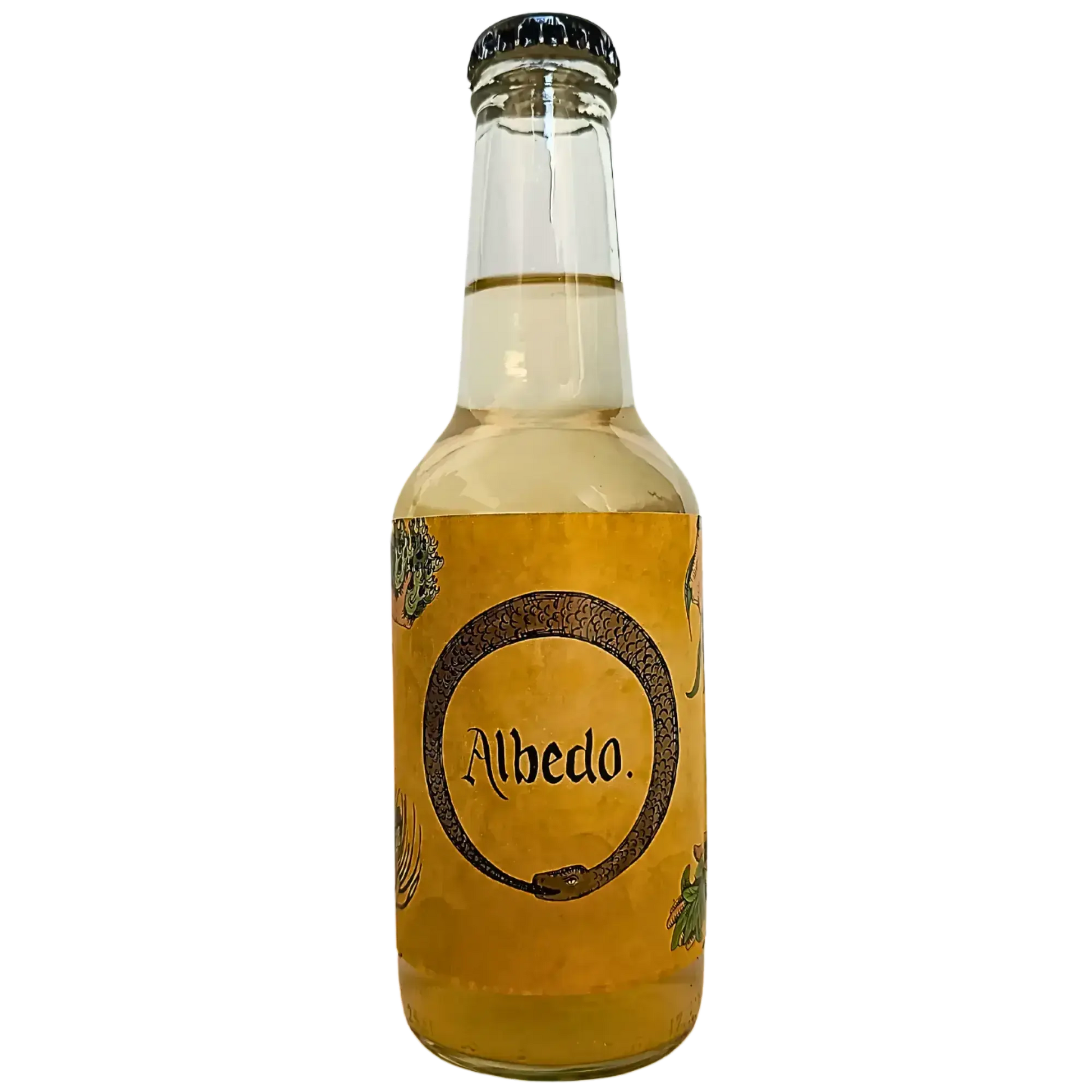 Albedo se elabora a partir de la fermentación natural de kéfir de agua, al que se añade una infusión compleja de plantas medicinales orgánicas como salvia, musgo de Islandia, brotes de pino y eucalipto. No se pasteuriza ni se microfiltra, sino que se estabiliza incluso fuera del refrigerador mediante una segunda fermentación controlada que mejora su estructura y conservación, sin comprometer su vitalidad.