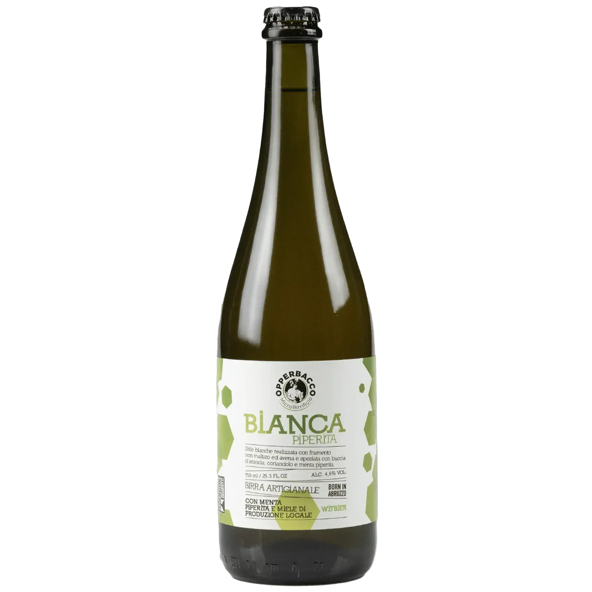 Opperbacco bianca piperita cl.75 – La inspiración para esta cerveza es la blanca belga, pero revisada en clave “territorial”: al clásico picante con cilantro y piel de naranja dulce se le ha añadido menta y miel local. El resultado es una blanca aterciopelada (gracias a la presencia de copos de avena) que combina las notas cítricas y especiadas canónicas con las notas melosas, florales y herbáceas/resinosas aportadas por los ingredientes especiales utilizados.